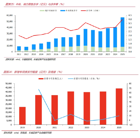 基于当前经济目标与政策导向,2026年财政预算与政府债券供给计划预计将呈现“总量扩张、结构优化、中央加力”的总体特征。我们认为,2026年赤字率继续维持在4.0%左右,全国财政赤字总规模将约为5.90万亿元。新增国债预计约7.07万亿元,支持“两重”、“两新”的超长期特别国债规模预计1.5万亿左右;地方政府债券发行规模约7.83万亿元。综合中央与地方债务,预计2026年新增政府债券总规模约14.9万亿元,符合中央经济工作会议“积极的财政政策要适度加力、提质增效”的总基调,发挥政府投资带动效应,推动投资止跌回稳。从市场影响看,2026年政府债券净融资规模预计较2025年将继续增加,尤其是超长期特别国债的发行规模扩大,可能对中长期债券市场利率形成阶段性压力。
