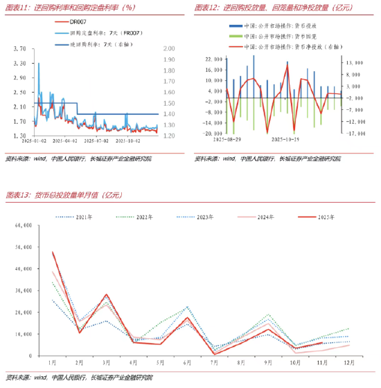 第三是措辞的转变。在官方表述上,相较于2024年多次强调“政策空间充裕”,2025年的官方表述更趋审慎,比如货币政策委员会在二季度例会的表述较2024年有所变化,强调要“灵活把握政策实施的力度和节奏”;11月13日证券时报刊登的某权威专家也指出,“货币政策虽然还有一定空间,但边际效率已明显下降。过度放松货币金融条件可能产生的一些负面效果也需要关注。比如资金空转、资本市场波动加大等“。在操作节奏上,随着降准降息空间的逐步收窄,央行的降息也更加谨慎。