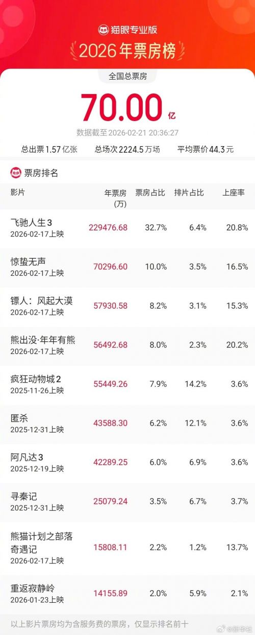 据网络平台数据,2026年年度总票房(含预售)突破70亿!《飞驰人生3》《惊蛰无声》《镖人:风起大漠》暂列年度票房榜前三位。你今年看了几部电影?最推荐哪一部?