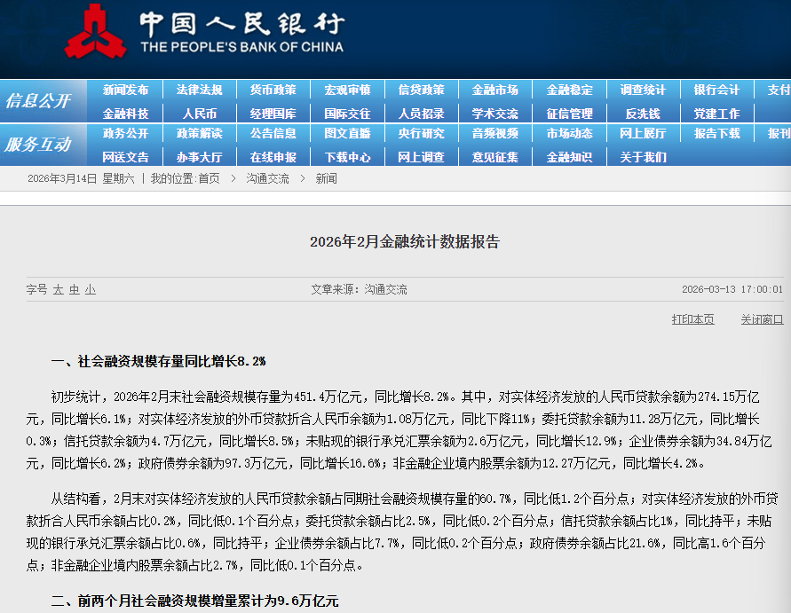 展望后市,业内专家认为,3月以来企业陆续进入节后开工状态,融资需求加快显现,叠加各项政策密集细化落地,“十五五”重大工程项目加速落地开工,预计将带动配套融资需求稳步释放,金融总量有望延续合理增长态势。(文馨)