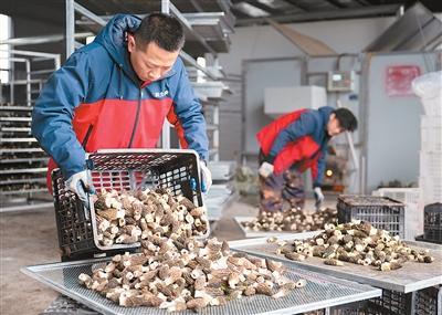 3月15日,在位于湖北省宜昌市远安县旧县镇的一家农业公司,工作人员摊铺新鲜羊肚菌。新华社记者 伍志尊摄