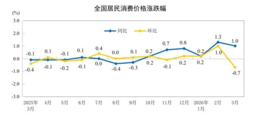 2026年3月份,全国居民消费价格同比上涨1.0%。其中,城市上涨1.1%,农村上涨0.9%;食品价格上涨0.3%,非食品价格上涨1.2%;消费品价格上涨1.3%,服务价格上涨0.8%。1—3月平均,全国居民消费价格比上年同期上涨0.9%。