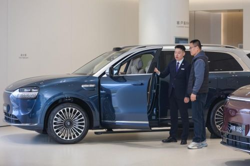 4月10日,在山东省青岛市李沧区,消费者在展厅选购新能源汽车。新华社发(张鹰摄)
