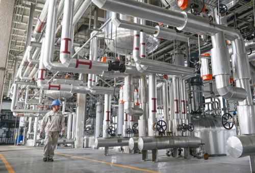4月15日,在天津灯塔涂料工业发展有限公司树脂车间,工作人员查看自动化生产设备运转情况。新华社记者赵子硕摄