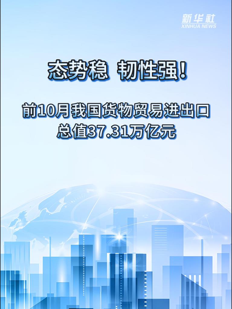 2025-11-08新华社记者邹多为、丁乐 面对外部冲击,我国外贸展现强大韧性。海关总署11月7日发布数据显示,今年前10月,我国货物贸易进出口总值37.31万亿元,同比增长3.6%,...